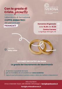 - Domenica 18 gennaio, il secondo incontro che approfondirà il tema “La grazia nel Sacramento del Matrimonio”. Al termine dell’appuntamento, è possibile fermarsi per un momento di convivialità con cena condivisa (ognuno può portare salato o dolce da mettere a disposizione).