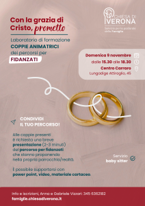 Il Servizio per la Pastorale della Famiglia della Diocesi di Verona propone un percorso formativo intitolato “Con la grazia di Cristo, prometto“, dedicato alle coppie che nelle parrocchie animano i percorsi per fidanzati. Un tempo per ritrovare forza, condivisione e ispirazione nel cammino che unisce le nostre comunità nella cura della famiglia e del sacramento del matrimonio.